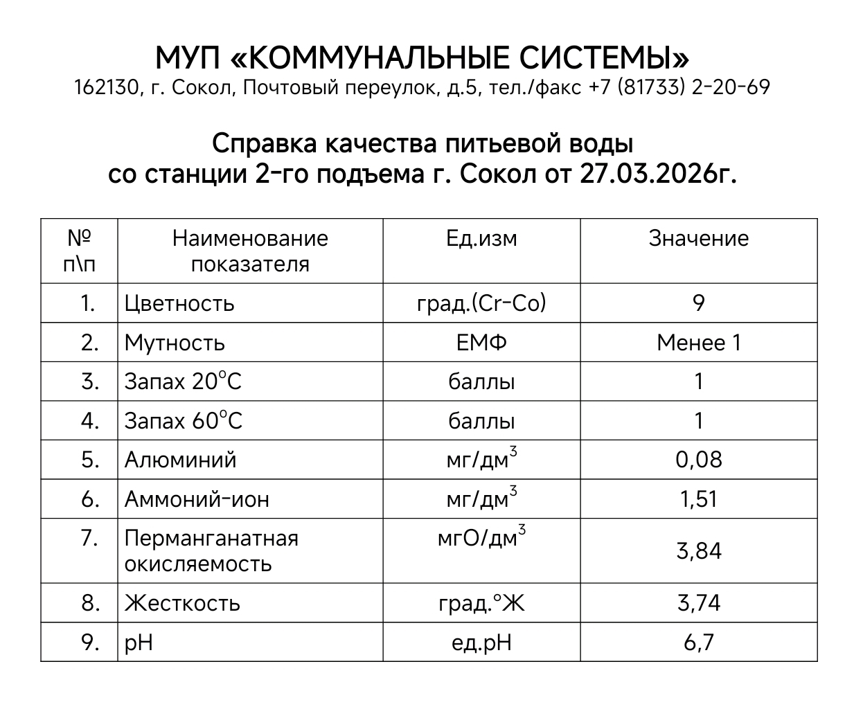 Справка качества питьевой воды на 27.03.2026